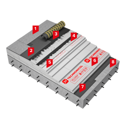 Особенностью данной системы является возможность ее монтажа даже при низких температурах, а также при попадании небольшого количества влаги в кровельный пирог в процессе монтажа. В качестве пароизоляции по бетонному основанию применяется наплавляемый материал Технобарьер. Технобарьер надежно защищает кровельный пирог от насыщения паром, при этом устойчив к возможным механическим повреждениям в условиях монтажа. В качестве теплоизоляционного слоя используется экструзионный пенополистирол ТЕХНОНИКОЛЬ CARBON ECO, отличающийся низким водопоглощением и высокой прочностью на сжатие. Для устройства разуклонки (в т.ч. в ендовах) применяются клиновидные плиты из экструзионного пенополистирола ТЕХНОНИКОЛЬ CARBON PROF SLOPE. Использование их совместно со сборной стяжкой способно облегчить вес кровельной конструкции, сэкономить время на монтаж всей системы, а также создать на кровле уклон без применения «мокрых» процессов, что очень важно в условиях низких температур. В системе используется двухслойный «дышащий» битумно-полимерный кровельный ковер, который позволяет избежать образования вздутий на ее поверхности за счет применения в качестве нижнего слоя специального материала Унифлекс ВЕНТ ЭПВ. Верхний слой из битумно-полимерного материала Техноэласт ПЛАМЯ СТОП наплавляется на нижний слой кровли. Согласно заключению ФГБУ ВНИИПО МЧС России кровельная конструкция имеет класс пожарной опасности К0 (45) и в зависимости от параметров железобетонной плиты предел огнестойкости REI 30 - REI 90, что позволяет применять систему в качестве покрытий в зданиях и сооружениях любой степени огнестойкости и с любым классом конструктивной пожарной опасности.
