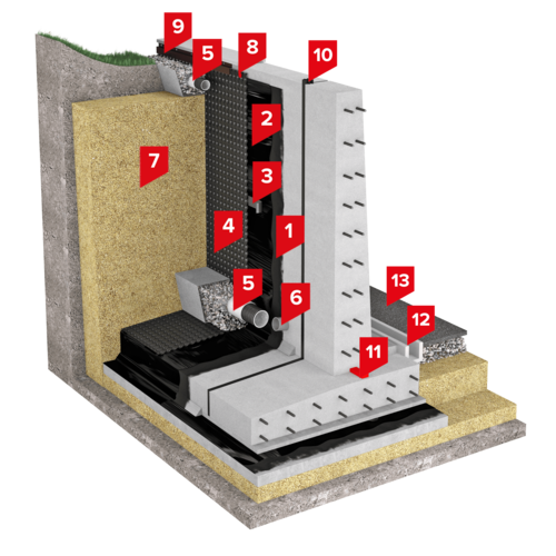 В качестве гидроизоляционного слоя в системе используется битумно-полимерная мастика ТЕХНОНИКОЛЬ №21, которая обеспечивает изоляцию и защиту конструкции от агрессивного воздействия грунтовых и поверхностных вод.