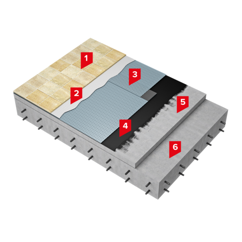Данная система состоит из гидроизоляционной мембраны, уложенной по предварительно огрунтованному основанию и финишной отделки плиткой, которая укладывается непосредственно на гидроизоляционный слой.
