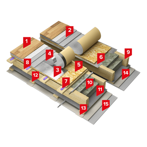 Пространство между деревянными балками заполнено плитами из каменной ваты ТЕХНОАКУСТИК или минеральной изоляции на основе стекловолокна ТЕХНОНИКОЛЬ Теплый каркас ПРОФ. Поверх балок выполняется сплошной настил чернового пола из листовых материалов. В качестве разделительного слоя между балками / обрешеткой и черновым полом укладывается звукоизоляционный битумно-полимерный материал Техноэласт АКУСТИК СУПЕР. Также возможно применение клея ТЕХНОНИКОЛЬ 508 PROFESSIONAL для жесткого соединения элементов конструкции между собой.