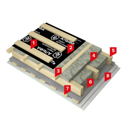 Пленка ТехноНИКОЛЬ МАСТЕР БАРЬЕР 4.0 располагается со стороны теплого помещения и защищает теплоизоляцию от переувлажнения изнутри. Пленка ТЕХНОНИКОЛЬ АЛЬФА ТОП, расположенная над утеплителем, защищает его от проникновения влаги, выдувания ветром тепла и фракций утеплителя.