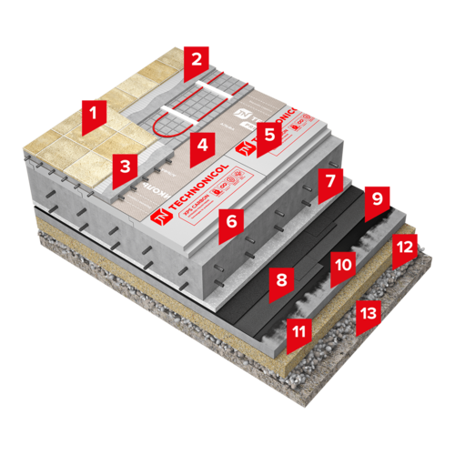 Данная система состоит из двух слоев битумно-полимерной гидроизоляционной мембраны Техноэласт ФУНДАМЕНТ, наплавленной на огрунтованную поверхность бетонной подготовки. В качестве теплоизоляционного слоя в системе применяется экструзионный пенополистирол ТЕХНОНИКОЛЬ CARBON ECO, который укладывается непосредственно на гидроизоляционный слой и выполняет функцию теплоизоляции.