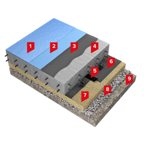 В данной системе применяется профилированная мембрана PLANTER, которая укладывается выступами вниз на песчаное либо песчано-гравийное основание, либо может выступать в качестве замены бетонной подготовки. Полимерные композиции TAIKOR наносятся на покрытие пола для его упрочнения, обеспыливания и, при необходимости, для придания декоративного внешнего вида.