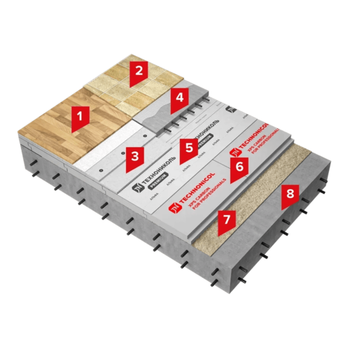 Система изоляции пола состоит из экструзионного пенополистирола ТЕХНОНИКОЛЬ CARBON PROF, который свободно укладывается непосредственно по ж/б перекрытию. При устройстве системы над холодным подвалом по слою теплоизоляции следует уложить пароизоляционный слой, который также выполняет дополнительную функцию защиты вытека «цементного молочка» из стяжки.