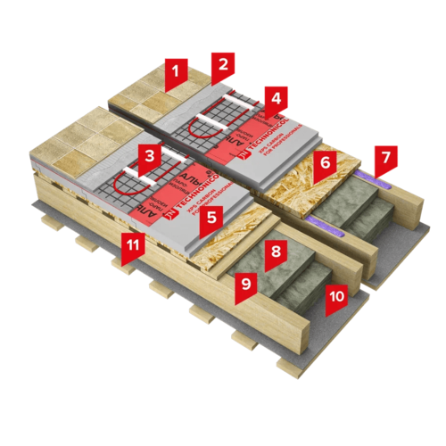 Система изоляции пола по деревянному основанию предназначена для ванных комнат, кухонь и других помещений, требующих обогрева. Система предусматривает в своем составе наличие нагревательных элементов (электрических термокабелей). С целью увеличения теплоотдачи от нагревательных элементов в сторону отапливаемого помещения, в системе пола применяется эффективная теплоизоляция Экструзионный пенополистирол ТЕХНОНИКОЛЬ CARBON ECO.
