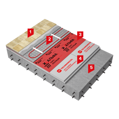 Система «теплого пола» включает в себя устройство слоя с нагревательными элементами поверх эффективного теплоизоляционного слоя ТЕХНОНИКОЛЬ CARBON ECO, уложенного на выровненное основание. Это решение увеличивает теплоотдачу в сторону отапливаемого помещения. Сверху на теплоизоляционный слой укладывается пароизоляционная пленка, предотвращающая вытекание цементного молочка из стяжки. Система ТН-ПОЛ Термо КМС позволяет сократить уровень ударного шума до 28 дБ всего при использовании экструзионного пенополистирола и подложки из геотекстиля.