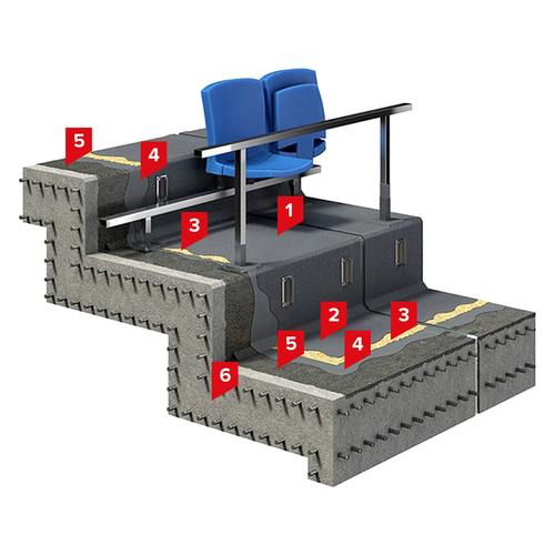 Система предназначена для создания защитных покрытий в спортивно-зрелищных сооружениях, на трибунах стадионов. Обладает высокой устойчивостью к атмосферным воздействиям. При необходимости, создается кварцнаполненное износоустойчивое покрытие в местах прохода людей.