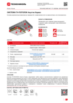 Система ТН-ПОТОЛОК Акустик Каркас представляет собой каркас из металлических профилей или деревянных брусков, который закреплен на относе от плиты перекрытия. Для крепления потолочных профилей к плите перекрытия используют подвесы или виброподвесы, которые также позволяют компенсировать неровности основания. На каркас уложены плиты из каменной ваты или стекловолокна, которые укладываются на несущий профиль сплошным слоем. Применение плит из каменной ваты или стекловолокна в системе и крепление каркаса на относе от плиты перекрытия обеспечивает акустический комфорт в помещении и позволяет скрыть коммуникации. В качестве облицовки используются ГКЛ, ГСП или ГВЛ листы.