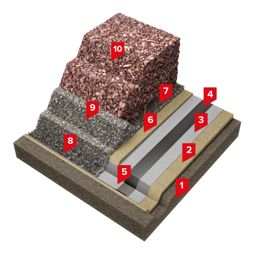 В системе предусмотрен подготовительный слой, выполненный из песка толщиной от 0,1 до 0,3 м с уклоном в сторону водосбросных траншей для оптимальной работы вышележащего пластового дренажа. В качестве разделительного слоя в системе применяется геотекстиль иглопробивной термофиксированный ТЕХНОНИКОЛЬ ПРОФ 500, который монтируется непосредственно на подготовительный слой.