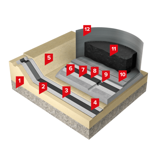 Каждый резервуар выполняется на отдельно стоящем фундаменте с предусмотренной системой гидроизоляции с системой контроля протечек. В случае устройства кольцевого фундамента, пространство внутри кольца заполняется подстилающим слоем песка с формированием уклона 1:100 от центра резервуара к краям. В качестве защитно-разделительного слоя в системе применяется геотекстиль иглопробивной термофиксированный ТЕХНОНИКОЛЬ ПРОФ 500, который укладывается непосредственно на грунтовую подушку. Поверх защитного слоя устраивается основной гидроизоляционный слой из геомембраны ГЕОПРУФ и защищается слоем геотекстиля. По периметру фундамента на расстоянии не более 5 м друг от друга устанавливаются радиальные дренажные трубки диаметром не менее 75 мм с отсыпкой щебнем, закрытые с торцов пластиковой сеткой 10×10 мм на уровне геомембраны. Оставшееся пространство внутри железобетонного кольца заполняется сыпучими материалами (щебень или песок), которые выполняют роль дренирующего слоя. При повреждении гидрофобного слоя под днищем резервуара, содержимое резервуара проходит через дренирующий слой и выходит через дренажные трубки, что сигнализирует о наличии протечек.