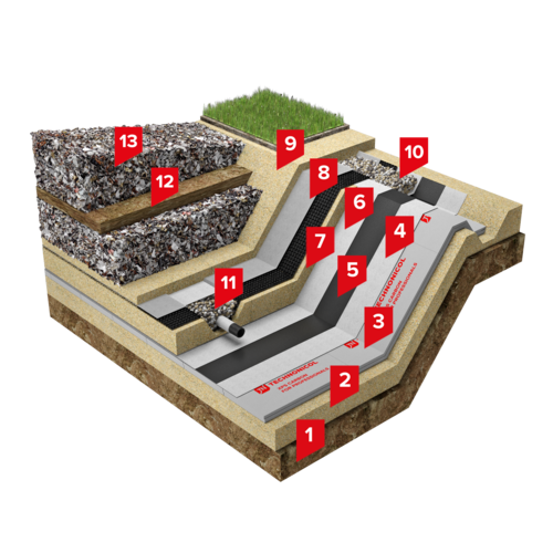 Система предназначена для устройства изоляции и дренажного слоя в ложе полигонов для размещения и захоронения бытовых (ТБО), твердых коммунальных (ТКО) и промышленных отходов. Основным гидроизоляционным слоем является геомембрана ГЕОПРУФ, выполненная из высококачественного полиэтилена. Абсолютная водонепроницаемость геомембраны исключает проникновение фильтрата в грунтовое основание и загрязнение окружающей среды. Для эффективного отвода фильтрата используется дренажный геокомпозит ПЛАНТЕР 2Д.