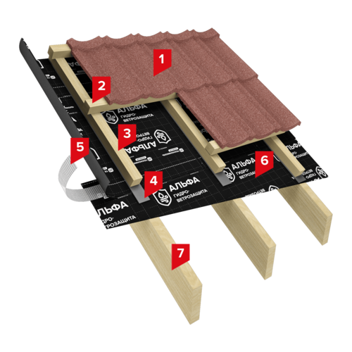В качестве контробрешетки используется деревянный брусок 50*50. Под композитную черепицу необходимо устраивать пленку ТЕХНОНИКОЛЬ АЛЬФА ТОП для предотвращения задувания снега в подкровельное пространство и защиты от влаги. Данный вид конструкции допускает последующее утепление без демонтажа конструкции.