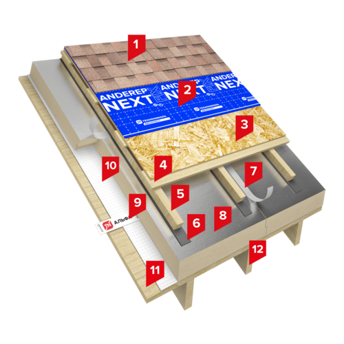 Особенностью системы является наличие непрерывного теплоизоляционного контура из легких и прочных большеформатных плит утеплителя марки LOGICPIR PROF, смонтированных поверх стропильных ног или декоративного потолочного настила. Благодаря такому способу монтажа минимизируется количество теплопроводных включений, снижается уровень теплопотерь и уменьшаются расходы на отопление. Также упрощается сам монтаж, исключающий подгонку утеплителя под шаг стропильных ног. Прочное алюминиевое покрытие плит PIR, позволяет отказаться от гидро-ветрозащитной мембраны, т.к. при проклейке стыков плит герметизирующей лентой получается непрерывный гидронепроницаемый слой, надежно предохраняющий всю конструкцию от увлажнения. Пароизоляционная пленка ТехноНИКОЛЬ МАСТЕР БАРЬЕР 4.0, монтируется со стороны теплого помещения, предотвращает диффузию пара в толщу ограждающих конструкций и предохраняет от конденсации внутренней влаги в кровельной системе. Под многослойную черепицу на сплошной настил укладывается подкладочный ковер ANDEREP NEXT FIX, который выполняет функцию дополнительной гидроизоляции. В качестве дощатого настила под многослойную черепицу может использоваться ориентировано-стружечная плита (ОСП-3) или ее аналоги. Дощатый настил укладывается на разреженную обрешетку, выполненную с шагом не более 300 мм.