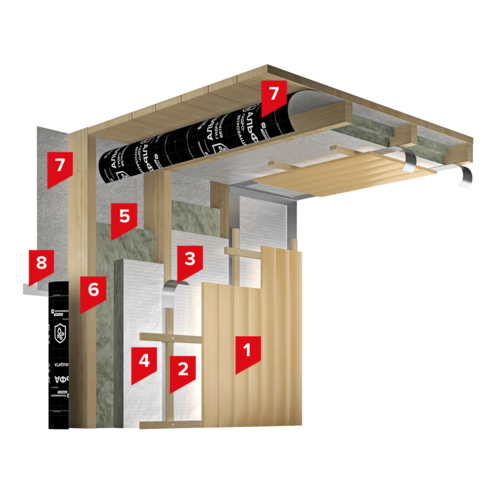 Система ТН-СТЕНА Каркас Баня является самым распространенным, простым и надежным способом утепления стен и потолка парной для эффективного сохранения тепла. Ее конструкция основана на деревянном каркасе, заполненном теплоизоляцией. Теплоизоляционный слой состоит из двух материалов: внутренний слой формируется из рулонов (матов) ТЕХНОНИКОЛЬ Баня и сауна, имеющих заводской односторонний фольгированный пароизоляционный слой, который при монтаже обязательно обращен в сторону парного помещения; внешний, основной слой выполняется из плит ТЕХНОНИКОЛЬ Тёплый каркас. Монтаж обоих видов утеплителя производится враспор непосредственно в ячейки деревянного каркаса. Крайне важно герметизировать стыки полотен внутреннего слоя (ТЕХНОНИКОЛЬ Баня и сауна) с помощью односторонней соединительной ленты ТЕХНОНИКОЛЬ АЛЬФАБЭНД 60. Для внутренней отделки парного помещения преимущественно используется евровагонка. Она крепится к предварительно установленной контррейке, которая создает необходимый воздушный зазор величиной 20 мм между фольгированной пароизоляцией и обшивкой.