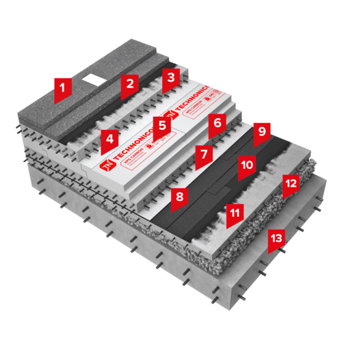 Для устройства теплоизоляционного слоя применяется материал XPS ТЕХНОНИКОЛЬ CARBON SOLID 500 отличающийся высокими теплоизолирующими характеристиками и повышенной прочностью на сжатие (прочность на сжатие не менее 500 кПа).
