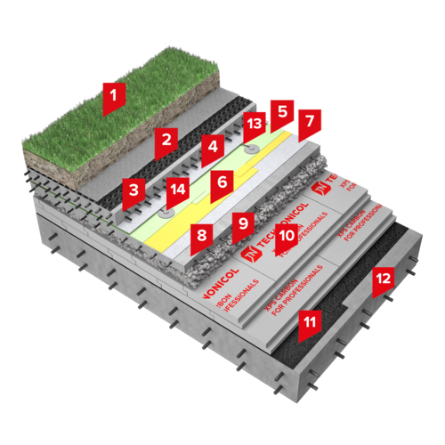 В системе ТН-СТИЛОБАТ КЛАССИК ГРИН поверх несущего железобетонного основания формируется слой пароизоляции для этого применяется наплавляемый материал Технобарьер. Он надежно защищает кровельный пирог от насыщения паром. Далее для устройства теплоизоляционного слоя применяется материал ТЕХНОНИКОЛЬ CARBON PROF отличающийся высокими теплоизолирующими характеристиками и повышенной прочностью на сжатие. Уклонообразующий слой формируется из керамзитобетона или плит экструзионного пенополистирола ТЕХНОНИКОЛЬ CARBON PROF SLOPE. Далее укладывается выравнивающая цементно-песчаная стяжка с армированием. В качестве подстилающего слоя применяется Геотекстиль иглопробивной термофиксированный ТЕХНОНИКОЛЬ ПРОФ 300. Поверх подстилающего слоя монтируется нижний гидроизоляционный слой из корнестойкой полимерной мембраны LOGICBASE V-SL , поверх которой монтируется верхний слой гидроизоляции из полимерной мембраны с фактурной поверхностью LOGICBASE V-ST, который позволяет создать герметичные карты площадью не более 150 м2. Проверка целостности всей гидроизоляции на этапе строительства либо эксплуатации производится методом вакуумного теста. Скрепление полотен гидроизоляционной мембраны осуществляется путем сварки нахлестов горячим воздухом при помощи автоматического сварочного оборудования с образованием двойного шва и центрального воздушного канала, который позволяет контролировать герметичность швов. В каждый герметичный контур и секцию устанавливаются ПВХ контрольно-инъекционные штуцеры и инъекционные трубки в количестве 5 шт., которые позволяют контролировать состояние гидроизоляции. При необходимости ремонт системы можно выполнить путём инъектирования ремонтных составов LOGICBASE INJECT на этапе строительства и/или эксплуатации здания.