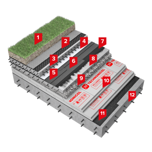 В системе применяется двухслойный водоизоляционный ковер из наплавляемых битумно-полимерных материалов Техноэласт ФУНДАМЕНТ в качестве нижнего слоя и Техноэласт ГРИН в качестве верхнего. Материал Техноэласт ГРИН дополнительно выполняет функцию защиты водоизоляционного ковра от повреждения корнями растений. Применение корнестойких материалов в озелененных крышах указано в п. 5.5.2 СП 17.13330.2017.