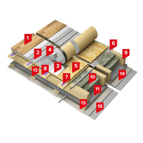Пространство между деревянными балками заполнено плитами из каменной ваты ТЕХНОАКУСТИК или минеральной изоляции на основе стекловолокна ТЕХНОНИКОЛЬ Теплый каркас ПРОФ. Поверх балок выполняется сплошной настил чернового пола из листовых материалов. В качестве разделительного слоя между балками / обрешеткой и черновым полом укладывается звукоизоляционный битумно-полимерный материал Техноэласт АКУСТИК СУПЕР. Также возможно применение клея ТЕХНОНИКОЛЬ 508 PROFESSIONAL для жесткого соединения элементов конструкции между собой.